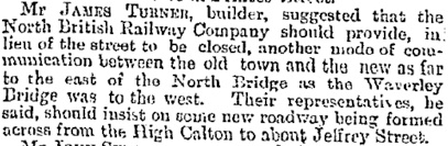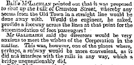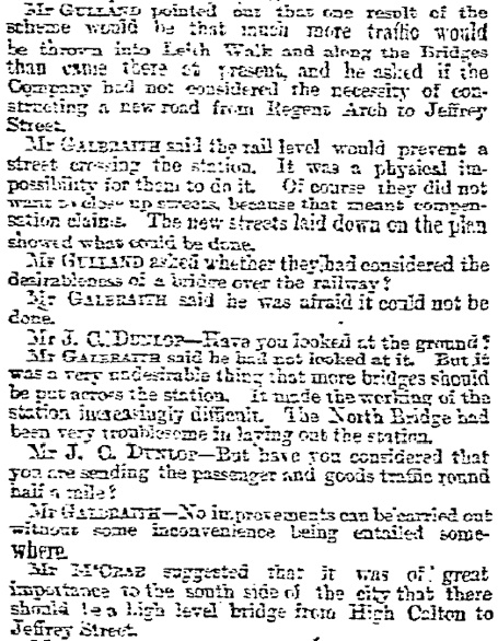 Mr Galbraith said he had not looked at it. But it was a very undesirable thing that more bridges should be put across the station. It made the working of the station increasingly difficult. The North Bridge had been very troublesome in laying out the station.