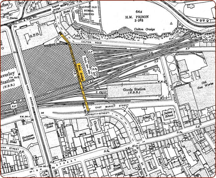 The Waverley Station redevelopment of the 1890s resulted in the footbridge connecting Jeffrey Street and Calton Road, as shown in the 1914 Ordnance Survey map below. You can see that it is slightly to the west of the historic Leith Wynd/Cranston Street route which is visible in the map below as the Parliamentary Division Boundary dotted line (remember this boundary traced the full length of Cranston Street in the 1893–94 map). However, it is still very close to the original Leith Wynd route which started where Jeffrey Street begins at the Netherbow and ended at Calton Road where it heads up to meet Leith Walk.